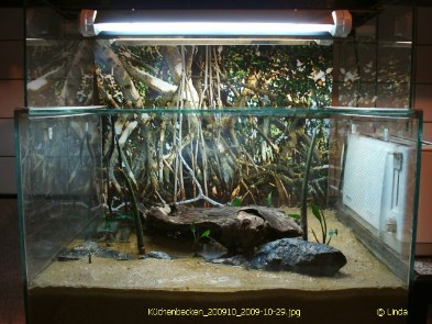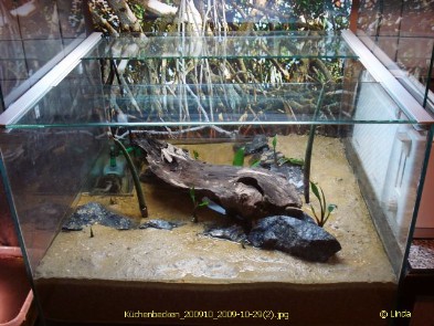 Die kleinen Küchenbecken haben sich zwar grundsätzlich nicht schlecht bewährt, trotzdem habe ich mich entschlossen, für meine jetzt wieder zwei Küchenschlammis ein Terrarium einzurichten, in dem sie - hoffentlich - gemeinsam wohnen können. Darüber hinaus hat die Erfahrung mit dem Filtersystem im Krabbenbecken gezeigt, dass die Kombination Kreiselpumpe und Mattenfilter selbst bei einem minimalen Wasserstand eine gute Wasserqualität sichert ohne das Substrat auszuschwemmen.
